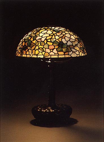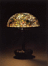 The dome-shaped shade painted with pine trees and ferns, signed. Height 23 inches (58.5 cm), diameter of shade 17 3/4 inches (45 cm)