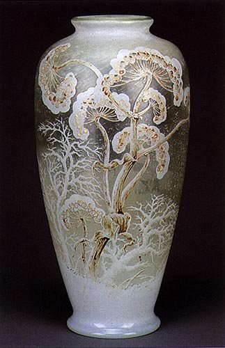Of shouldered ovoid form, etched and enameled with a winter landscape, bears inscription Et les hyvers toujours nous preparent des fleurs, Em. Hinzelin, signed. Height 15 1/2 inches (39 cm)