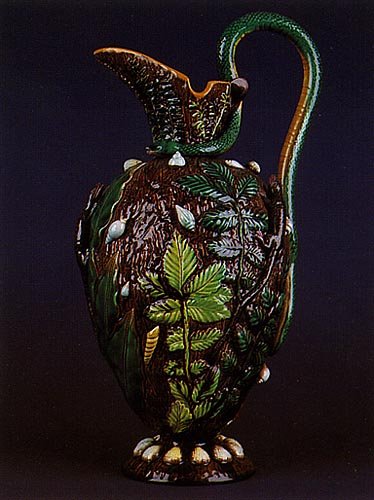 Circa 1873 Of ovoid form with coiled snake handle, the brown-glazed tree bark molded body applied with leaves, shells and lizards, the foot with a rim of scallop shells, the interior glazed in pale blue, impressed factory marks. Height 17 1/4 inches (44 cm)