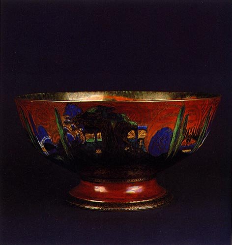 The exterior decorated in the Poplar Trees pattern, the interior with a central mermaid medallion bordered by the Woodland Bridge pattern, monogrammed, printed and enameled factory marks. Diameter 11 1/4 inches (28.5 cm)