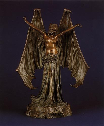 The seminude maiden attired in headdress and flowing skirt, her arms outstretched before her large bat wings, raised on an irregular rocky base, signed LEONARD, 3CA, AB.